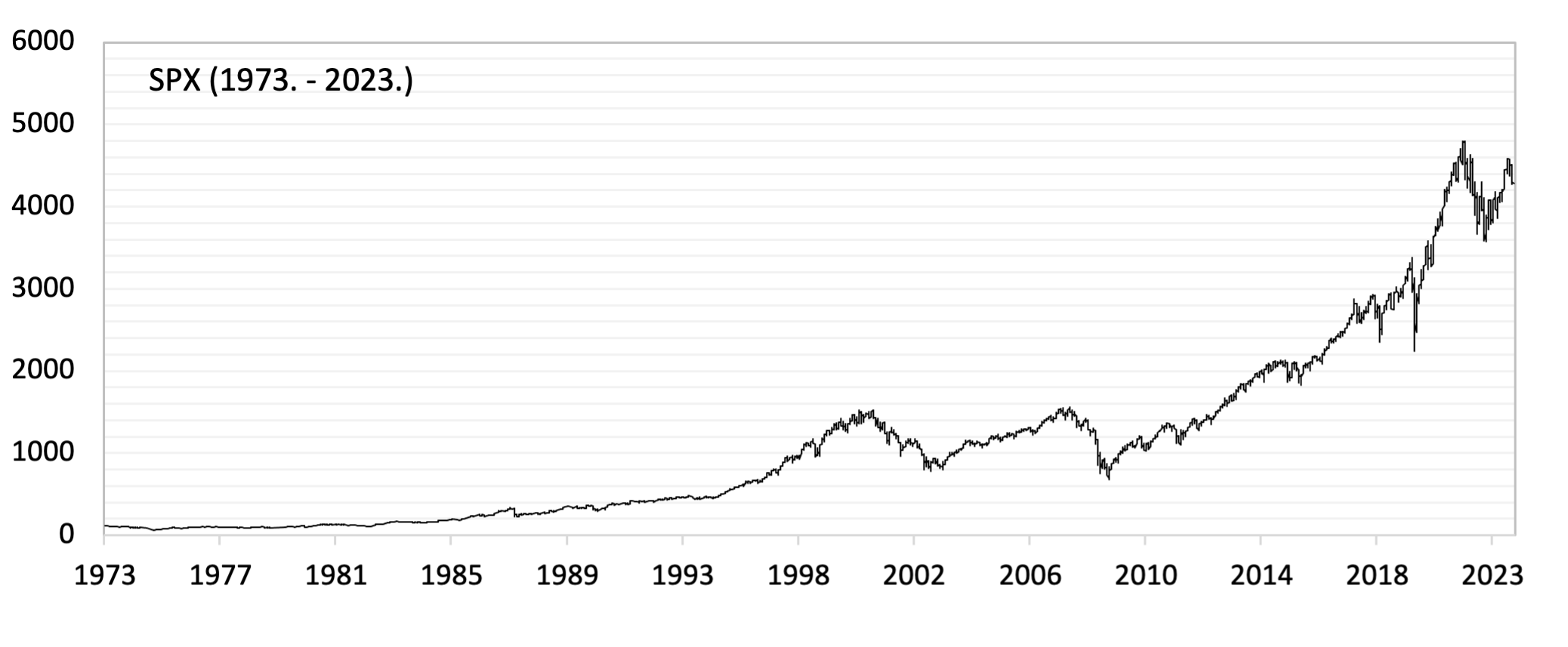2023. godina je označila 50. obljetnicu jedne od najpoznatijih knjiga o investiranju „A Random Walk Down Wall Street“ u kojoj je Burton Malkiel pokazao kako prosječan investitor vrlo teško može pobijediti tržište te uputio čitatelja na indeksne fondove. Zanimljivo, točno 20 godina nakon izdavanja knjige, stvoren je trenutno najveći i najpopularniji pasivni fond na svijetu SPDR S&P 500 popularno nazvan SPY, fond kojim se trguje na burzi i prati najpoznatiji dionički indeks SPX. SPY se pokazao kao vrlo jeftino, a uspješno rješenje za male, ali i velike investitore uz visoki prosječni godišnji prinos od 9.65% u zadnjih nekoliko desetljeća. Iz povijesnih podataka je jasno kako su dionice dugoročni pobjednici u smislu prinosa, a SPX je već dugo predvodnik i benchmark svjetskog dioničkog tržišta. Iz tog razloga prirodno je da se želja za investiranjem u dionice iz godine u godinu preusmjerava upravom k tom indeksu/seriji ETF-ova koji ga prate.